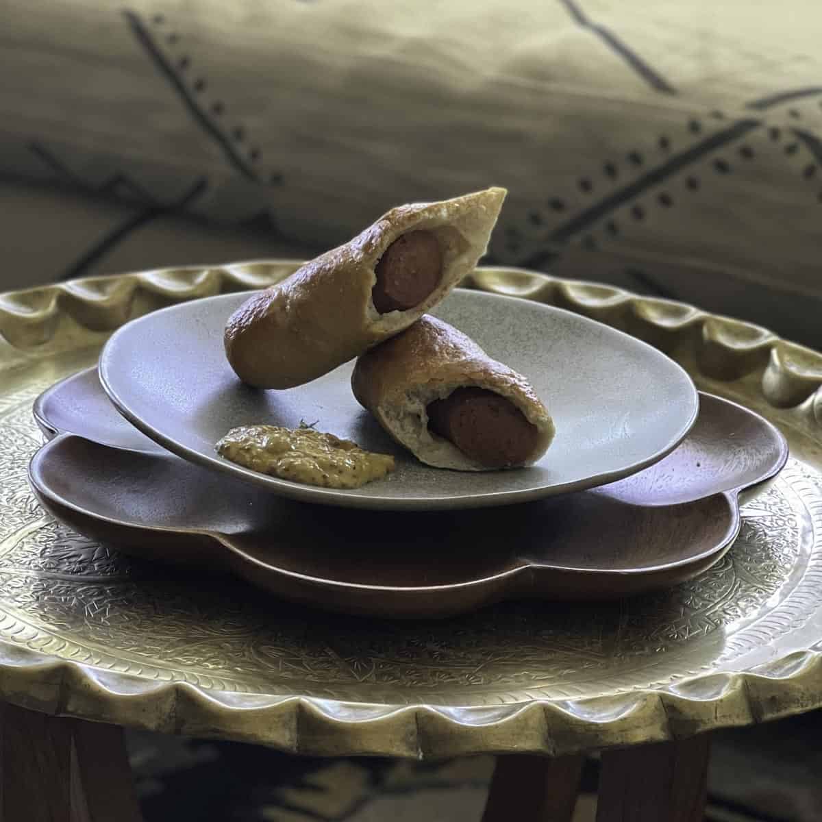 We use our plain bagel dough for these treats. Rolled flat and then cut in to strips and wrapped around an all beef kosher hot dog. Then boiled and baked and ready to devour!